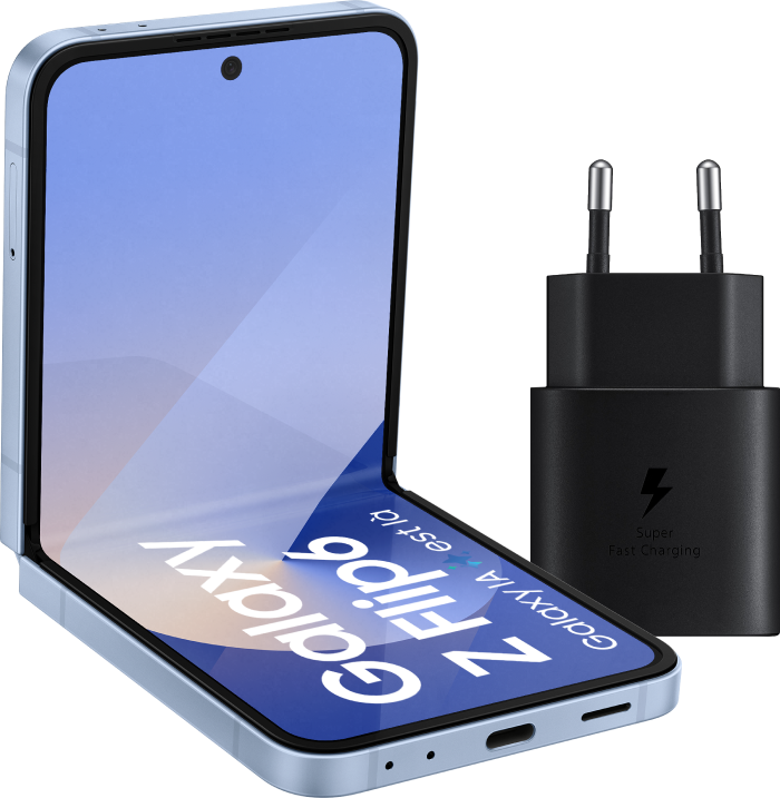 Laad je Samsung Galaxy Z Flip 6 512GB Blauw 5G binnen één uur volledig op met de meegeleverde Samsung Oplader 25W Zwart. De Samsung Flip 6 is een vouwbare smartphone. Opengeklapt gebruik je het 6,7 inch full hd scherm van de Samsung Flip 6 als normale smartphone. Als je de Flip 6 dichtklapt, bekijk je op het compacte 3,4 inch scherm aan de buitenkant je meldingen of verstuur je berichten. De Samsung Flip 6 is geschikt voor de zwaarste taken. Je speelt bijvoorbeeld 3D games of bewerkt foto's en video's met Galaxy AI. Aan de achterkant van de Flip vind je 2 camera's waar je haarscherpe foto's mee maakt. De 4.000 mAh batterij is aan de kleine kant, dus je moet deze Samsung smartphone soms gedurende de dag opladen. Op het 512 GB opslaggeheugen van de Samsung Flip 6 is ruimte voor je apps, foto's en series en films.